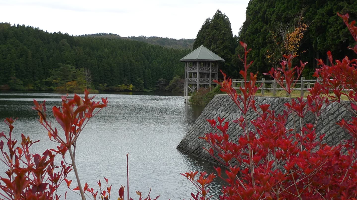 大正5年、最上側以北12ヶ村の美田を潤す農業用水として造成された。池の中に朱塗り橋と社がある。