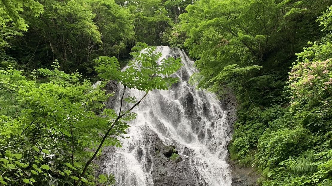 社殿の後ろで、岩肌を伝って流れ落ちる滝。